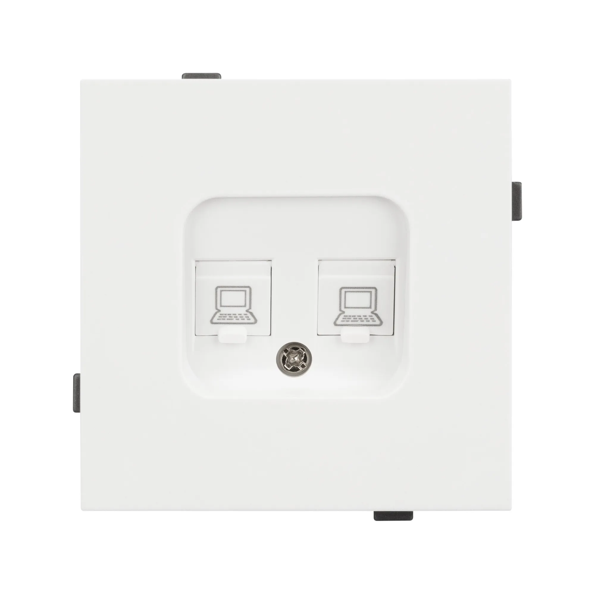 Механизм компьютерной розетки на 2 поста 6-й категории. Цвет - белый, с Soft-Touch покрытием. Без фронтальной рамки. Уровень пылевлагозащиты IP20. Розетка устанавливается в стандартный подрозетник круглого сечения диаметром 60мм.