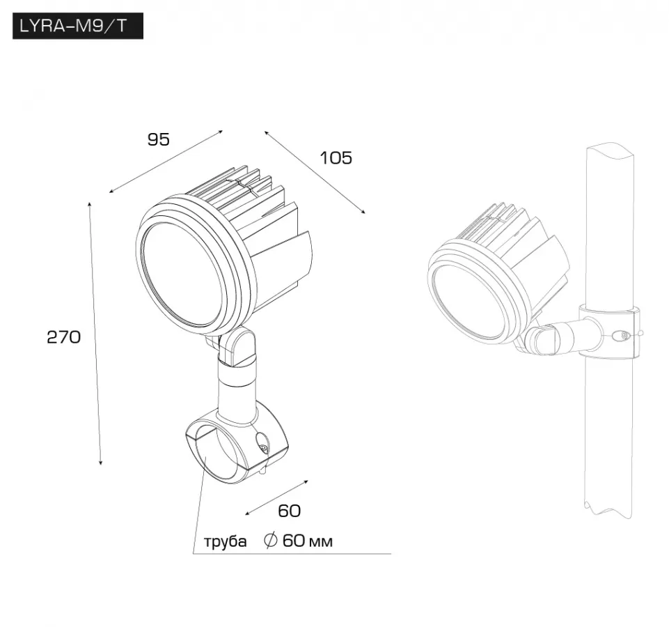 | 1 | LYRA-M9T | С креплением на трубу / 10°30°/60° | 9 Вт | 1305 Лм | 4000K / 3000K | 105*95*215 мм |