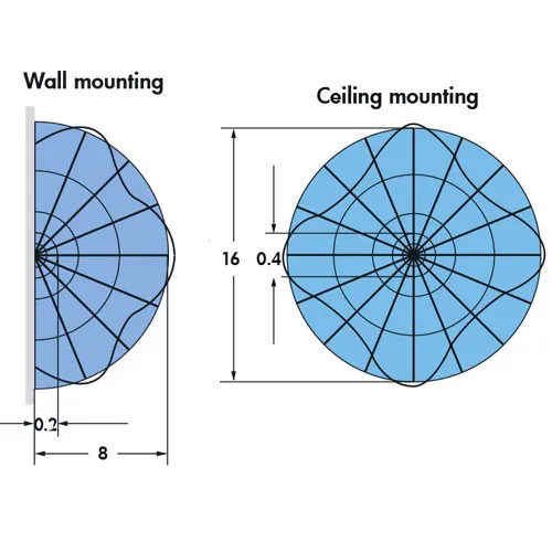 - Угол обнаружения 360° или 160° в зависимости от типа монтажа: на потолке или на стене