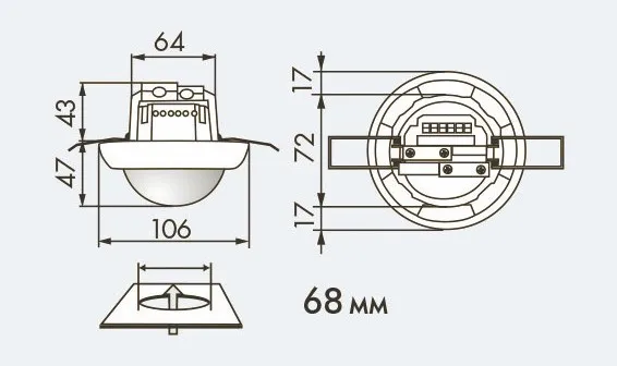• Дистанционно управляемый потолочный датчик движения с узким диапазоном обнаружения, специально для коридоров, скрытый монтаж в подвесной потолок