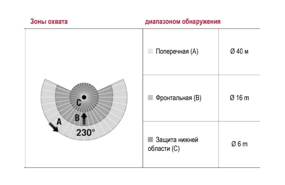 | Угол обнаружения | 230° (2 x 115°) + защита нижней области обнаружения 360° |