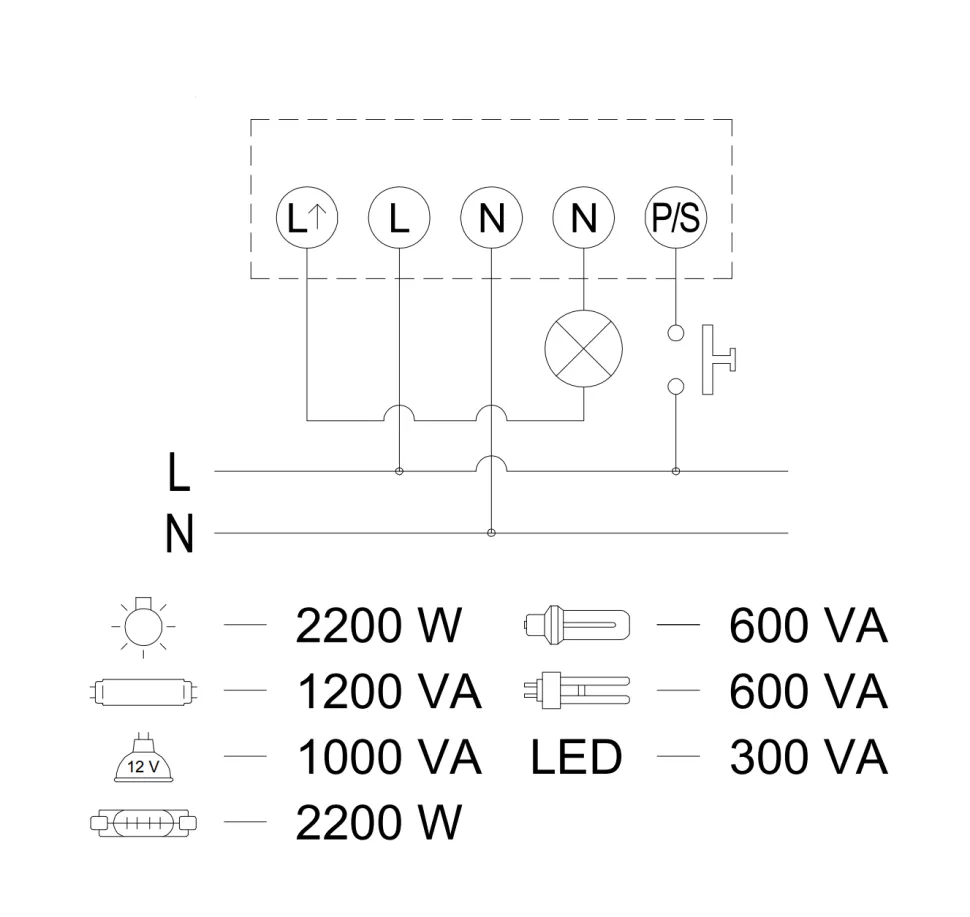 • Оснащен реле для повышения максимальной мощности подключения до 300 VA для светодиодных ламп или до 1200 VA для люминесцентных.