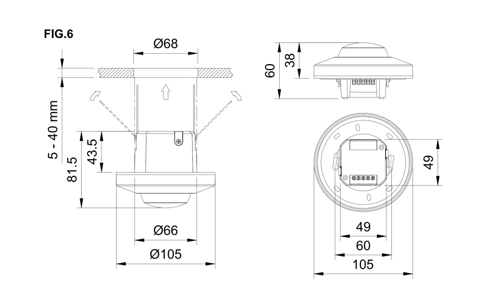 • Установка на потолок в отверстие 68 мм с помощью прилагаемого аксессуара.