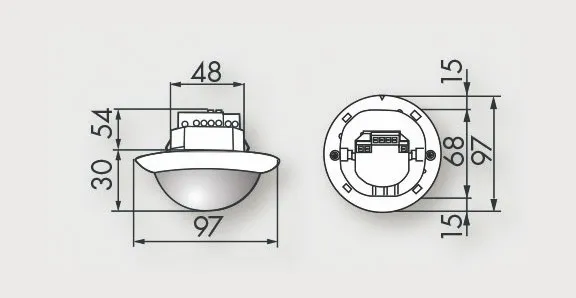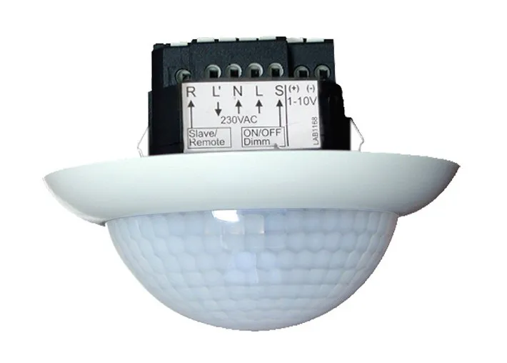 - Дистанционно управляемый потолочный датчик присутствия PD4-M-DIM в исполнении для диммирования света для потолочного монтажа, с круговым диапазоном обнаружения и дальностью действия 24 м