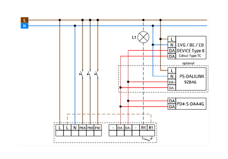 - До 64 драйверных светильников DT8 (цветовой тип Tc), может потребоваться удвоение выходного тока DALI с помощью аксессуаров