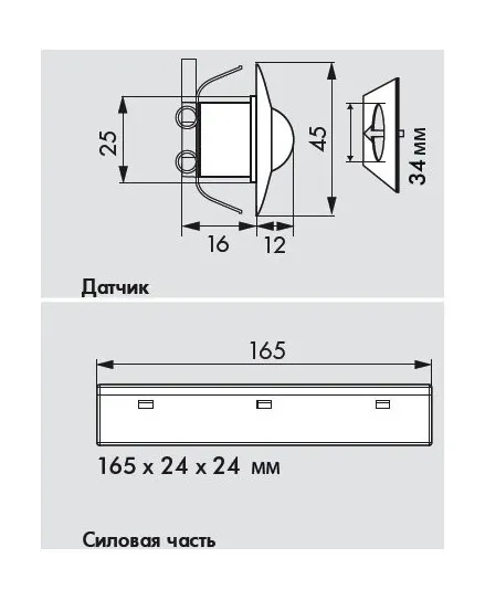 - Габариты Датчик: Ø 45 x В 28 мм. Силовая часть: Д 165 x Ш 24 x В 24 мм