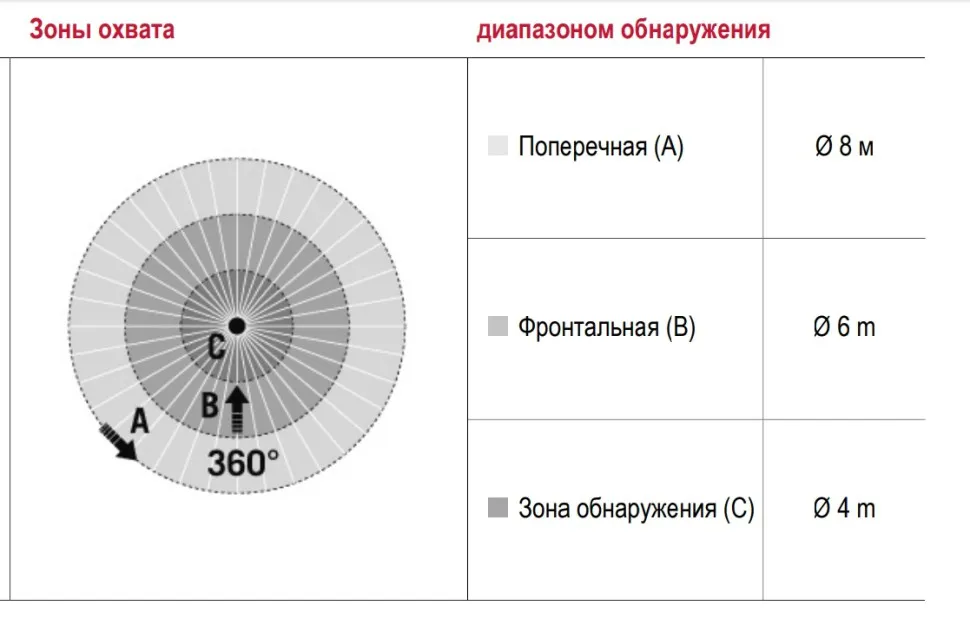 | диапазоном обнаружения Фронтально | Ø 6 м |