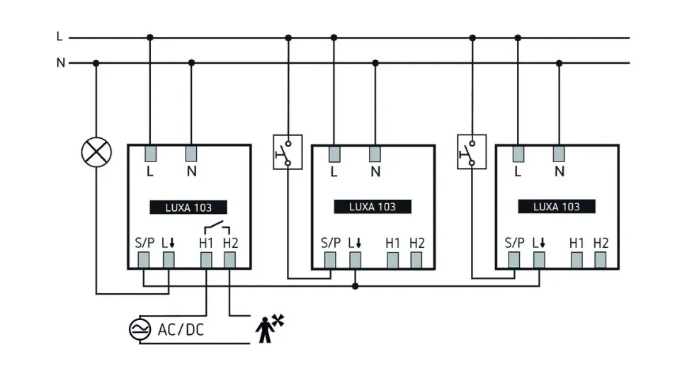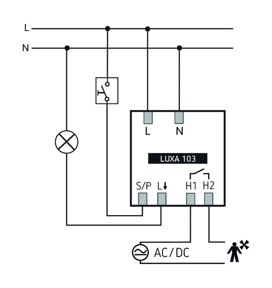 - 1 канал освещения (реле 230 В) и 1 канал присутствия (реле без потенциала для управления HVAC)