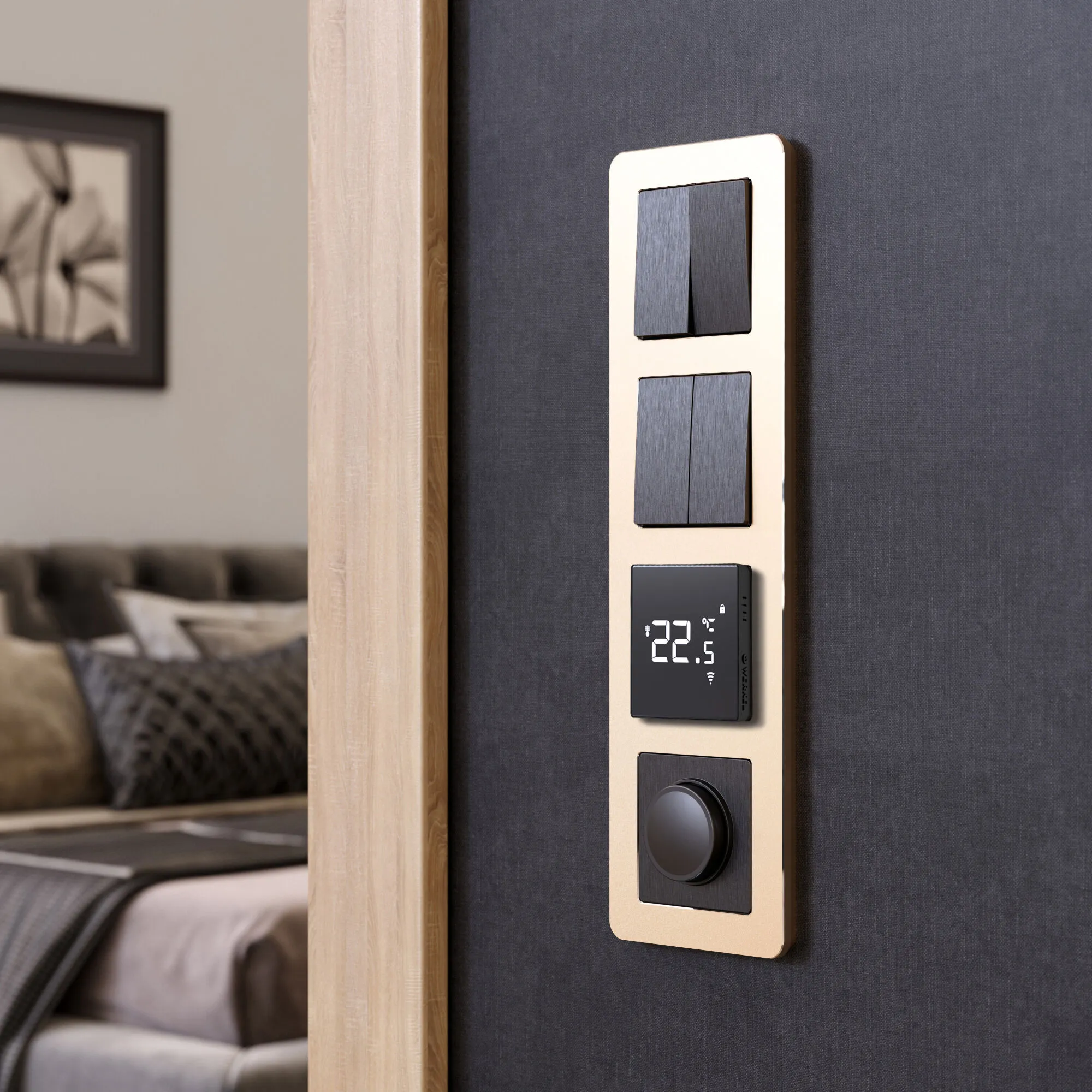 Platinum — коллекция рамок из литого анодированного алюминия. Сатиновая поверхность с шероховатой фактурой и изящные акцентные фаски на гранях создают премиальный дизайн, который подчеркивается благодаря увеличенным размерам рамки — 95×95 мм.