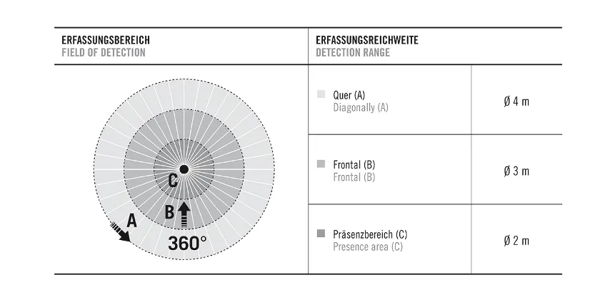 | Угол охвата, диапазон обнаружения | Ø 2 m |
