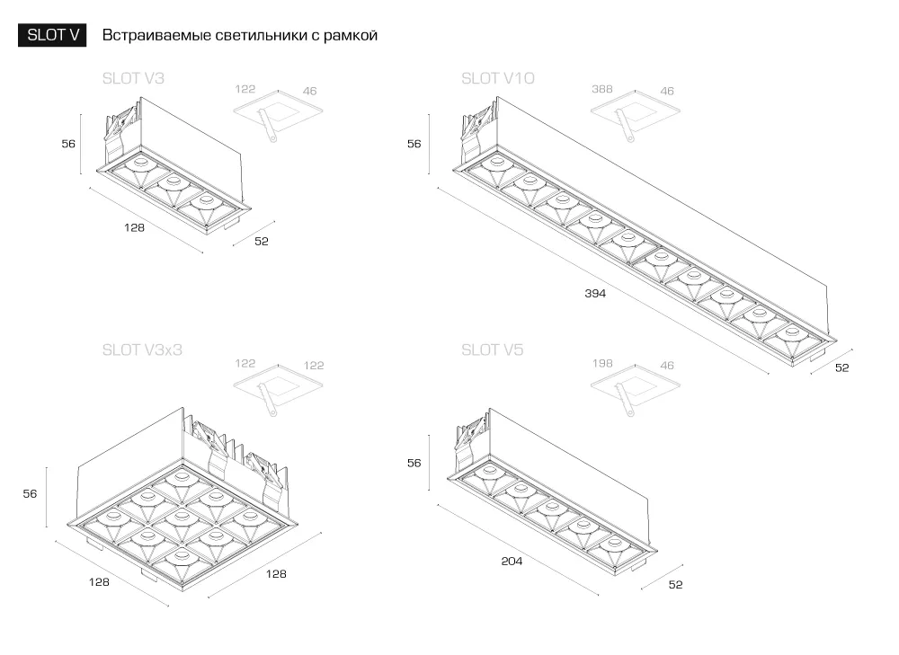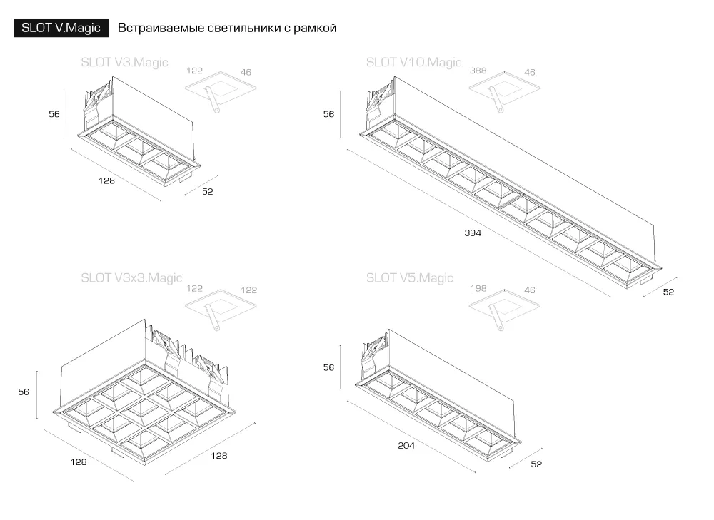 Встраиваемые светодиодные светильники Slot V x5 с декоративной рамкой. Модификации с индексом "Magic" имеют прямоугольное пятно света (асимметричное светораспределение 35°x70°).