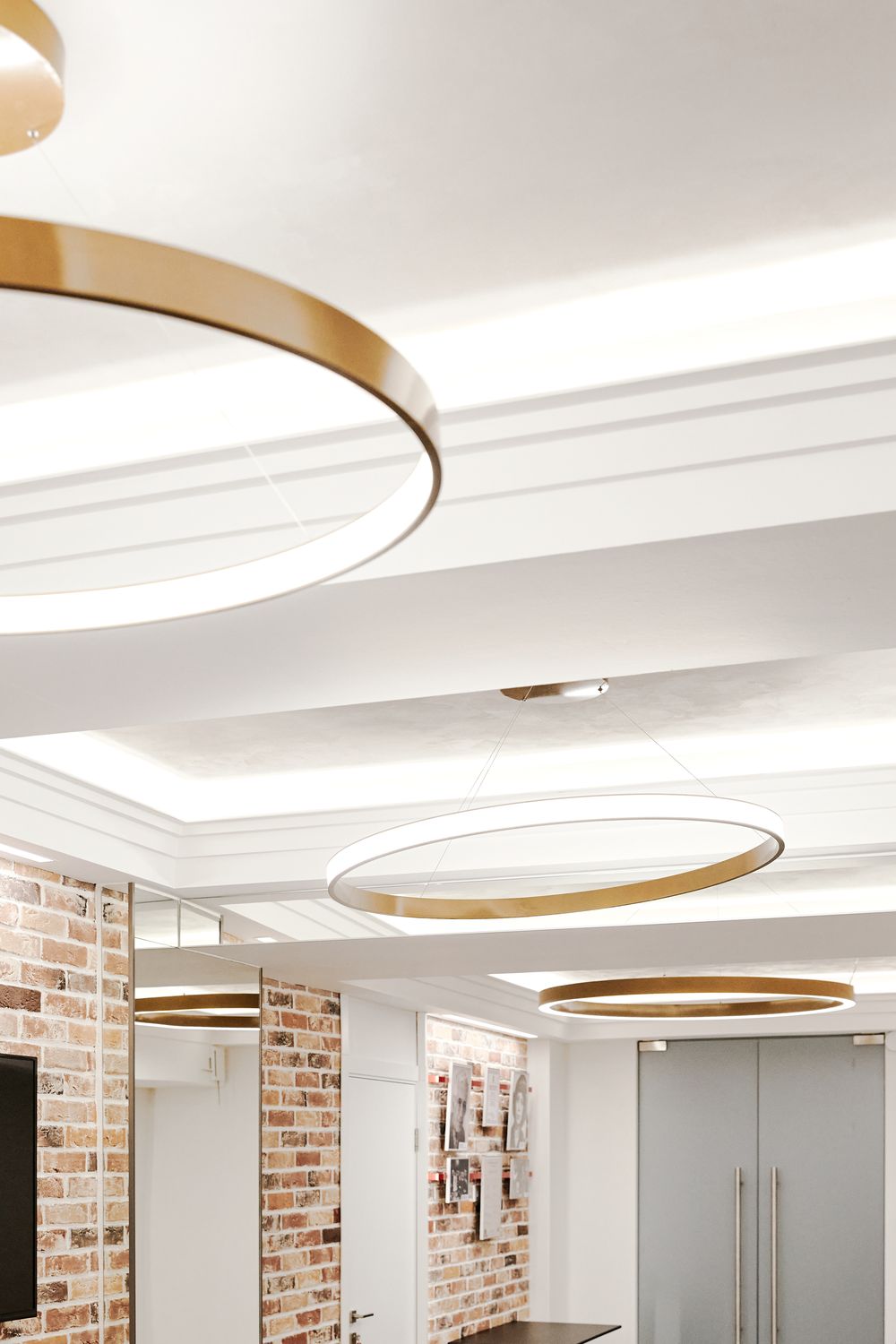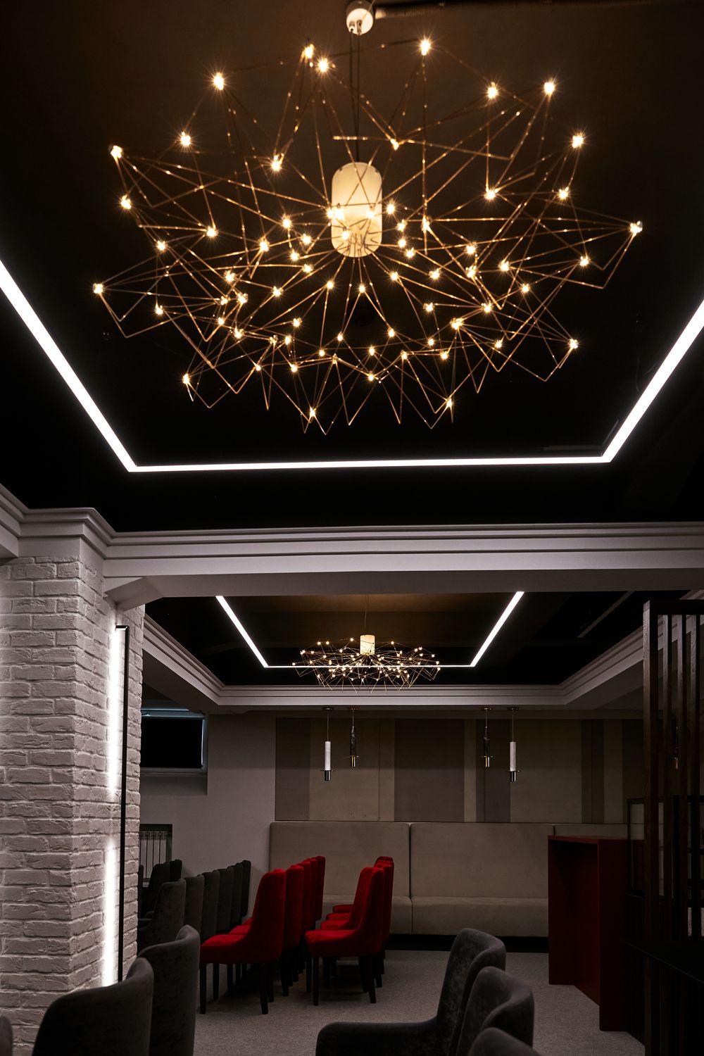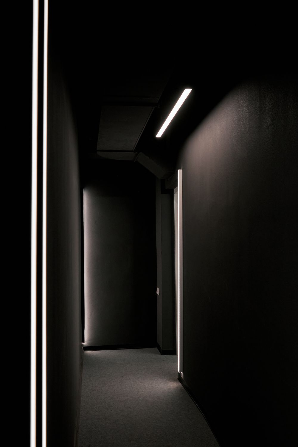 Свет играет большую роль в создании комфортного пространства. Линейные светильники отлично подошли для этого проекта. За счет световых линий на стенах в пространстве создается впечатляющий контраст темного помещения с яркими световыми полосами.