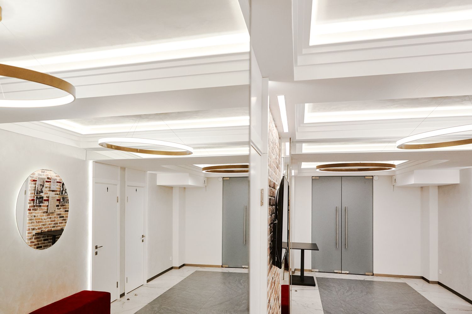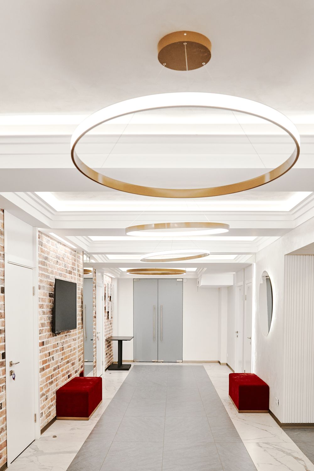 По задумке дизайнеров в фойе театра использованы линейные светильники крашенные по RAL.